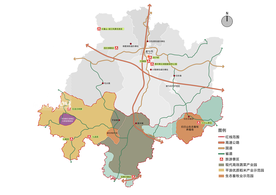 都匀大农业公园系统整体构建围绕道路本身承担的功能、道路周边景观、道路的交通属性三个圈层进行打造;从“人流”到“留人”,建设乡村休闲度假目的地;政企合作,农民受益,促进美丽乡村建设三大发展思路,总体呈现一环一带两重点·三区多园多节点布局。一环即321国道—206省道—311省道—205省道联通的整体道路环线串联都匀全域,打造农业及旅游环线交通系统。一带即以050国道和210国道为核心的纵向农业旅游观光带。两重点即以罗雍水库为核心的平浪农业公园及以归兰山为核心的水族风情旅游度假小镇。三区即毛尖镇茶叶主产区、平浪镇优质稻米主产区和墨冲镇高效蔬菜主产区。多园即围绕主要道路沿线打造的农业综合开发园区。多节点即沿主要交通道路的多个美丽乡村、多种景观或文化节点及公共服务平台建设。