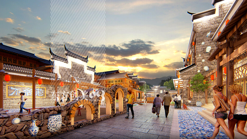 我们以鹤舍古村的最具代表性人物(袁绍起)为原型,通过策划编写故事,让瓷商创业故事成为整个鹤舍古村的一个故事主线,适当的导入现有的古建筑中。利用高科技手段,以水幕演艺的方式再现当时历史的局部场景。