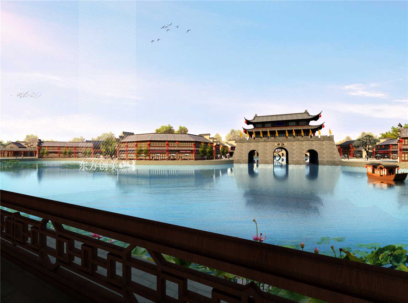 望江楼:在规划区的水上十字要塞,打造一座望江楼,桥拱式底基,四面通透,下可行船,是整个水镇的制高点,登楼可望整个水镇风貌,是水镇标志性景观建筑。