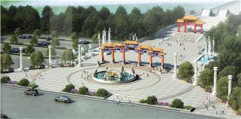 入口广场:将国道隔离的南北广场通过轴线延伸、照壁呼应的方式打通南北片区的文化关联与配合关系。南北两侧隔离9柱围合,北侧入口5柱冲天牌楼正对南侧九龙壁。大空间区域便于景区集散管理。